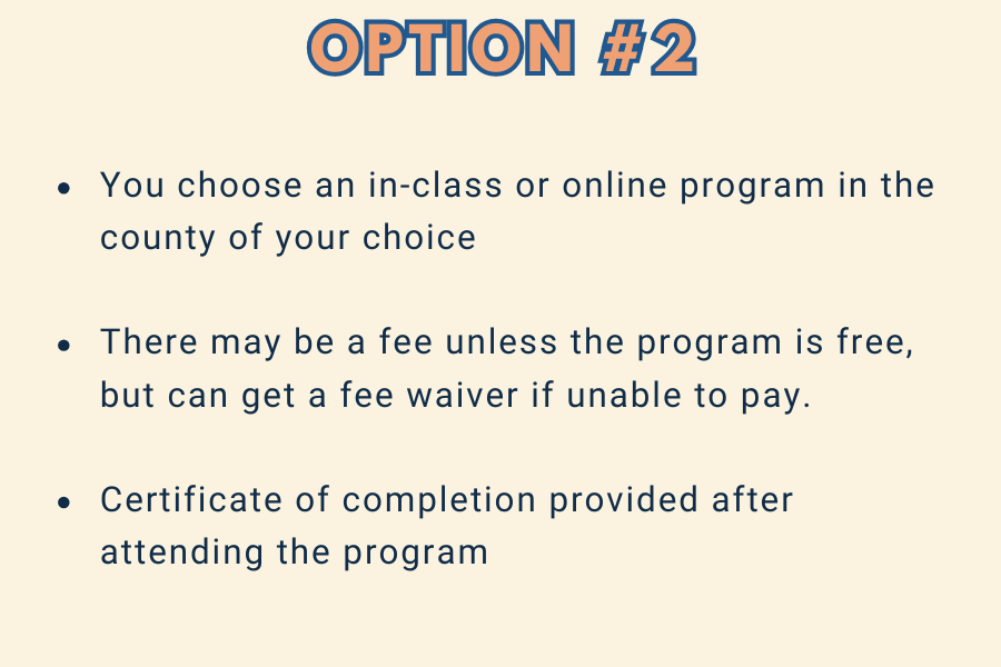 FURTHER DETAILS: Certified PEAP programs may charge parents a fee of no more than $100 to attend the program, but are required to offer a reduced fee or no fee based on the parent’s inability to pay. If you are a victim of domestic violence and/or you do not feel safe attending a parent education program, then contact a certified parent education program located in the county of your choice, and explain your situation to the program administrator, who can assist you. In order to protect your safety, you will be permitted to not attend the program and will receive a Certificate of Completion from the program.